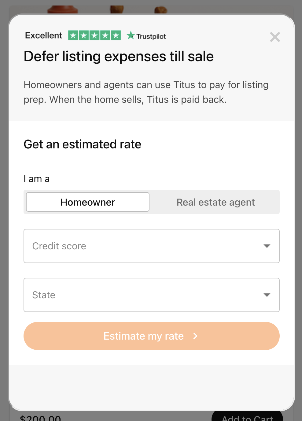 You can do this by including a browser SDK that opens a modal on top of your site where customers can see if they qualify to pay at close, see their rate, and learn more about Titus.